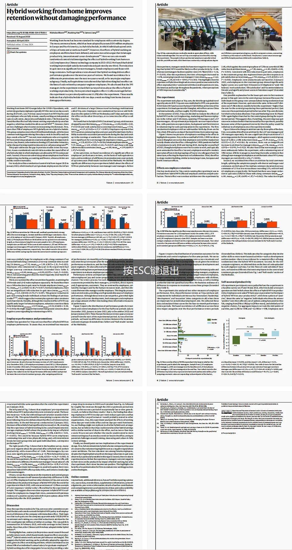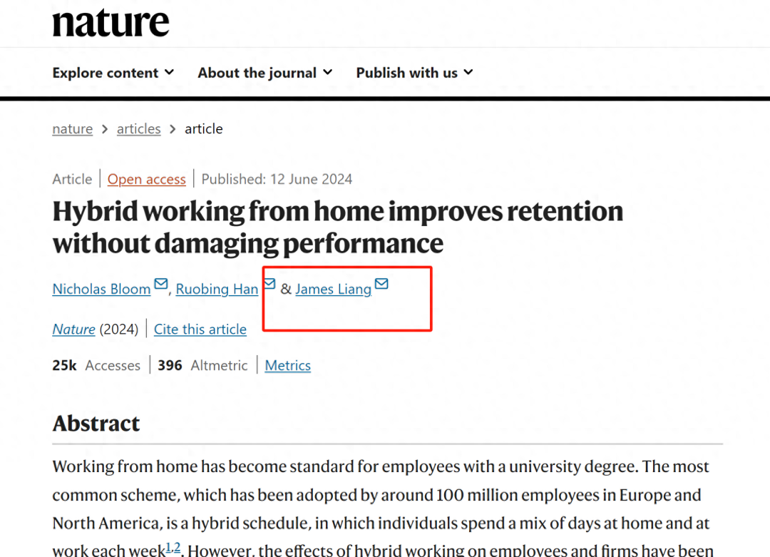 近日在学术圈梁建章做了一件大事情,2024年6月12日,梁建章与两名高校老师共同通讯在Nature在线发表了一篇论文,该论文主要研究了混合在家工作对工作效率及离职率等方面的影响。