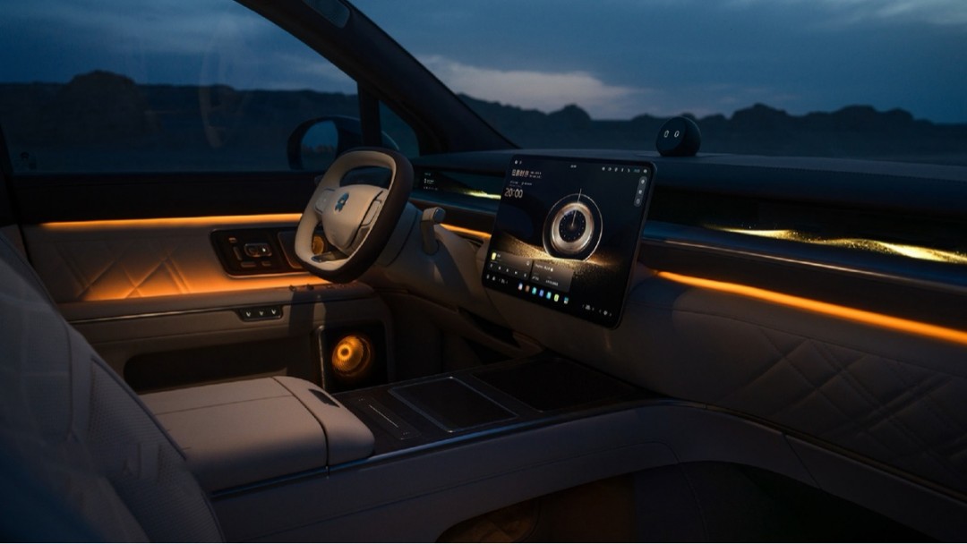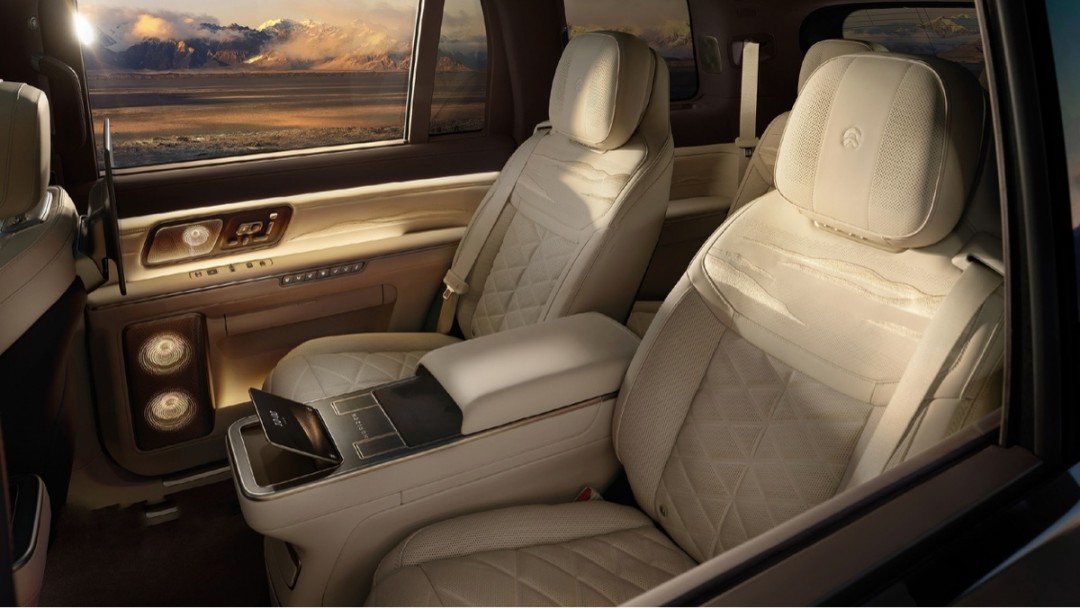 配置上,蔚来ES9座舱采用“天空岛”与“智能行政中岛”布局,二排飞航零重力行政座椅配备2.3米连贯椅面及42点全维深层按摩系统,包含行业首创20点机械足底按摩;全球首发阵列式LC智能隐私调光车窗,变色速度行业领先,搭配智能行政中岛、双16英寸专属行政屏、车载飞书会议系统及磁吸茶台,满足商务办公与社交会客需求。