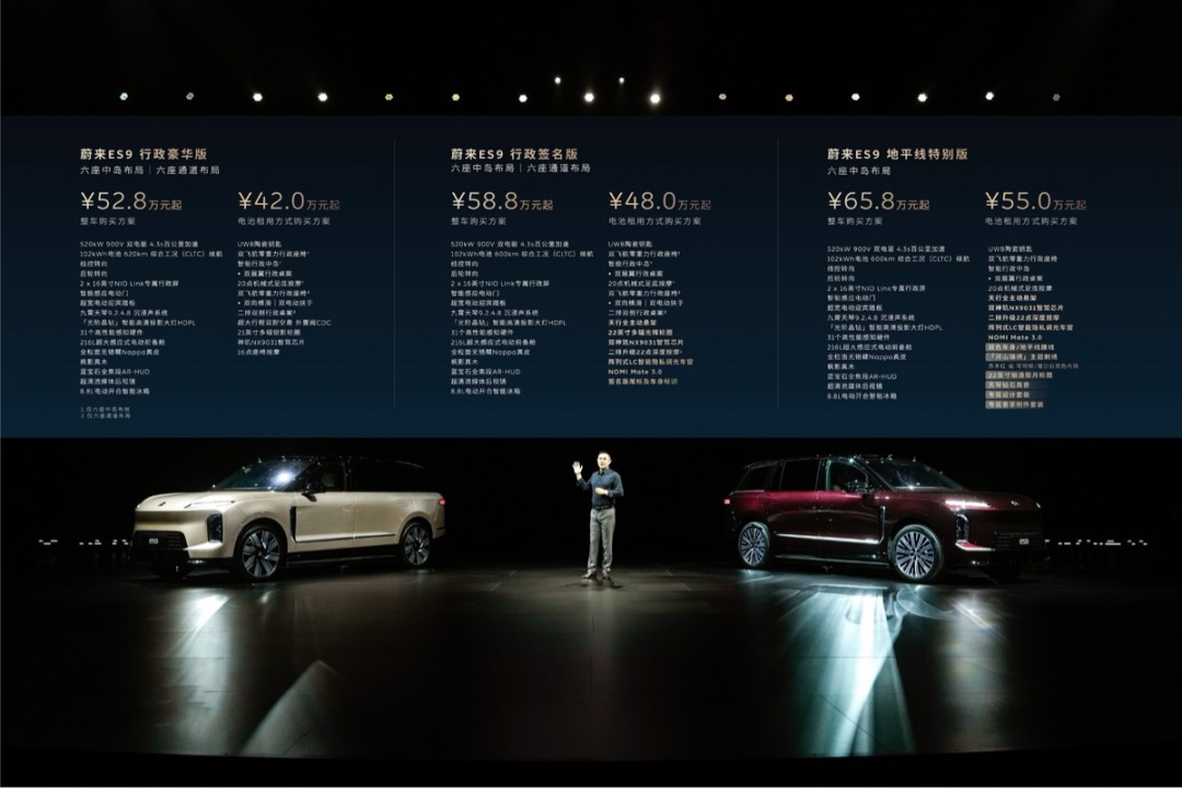 【TechWeb】4月10日消息,蔚来全新科技行政旗舰SUV蔚来ES9正式发布并开启预售。新车共推出三个版本,涵盖整车购买与电池租用(BaaS)两种方案。其中,行政豪华版整车预售价52.8万元起,BaaS方案预售价42万元起;行政签名版整车预售价58.8万元起,BaaS方案预售价48万元起;地平线特别版整车预售价65.8万元起,BaaS方案预售价55万元起。