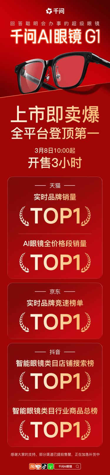 千问AI眼镜G1爆卖!3小时全平台登顶第一、部分渠道已售罄观点