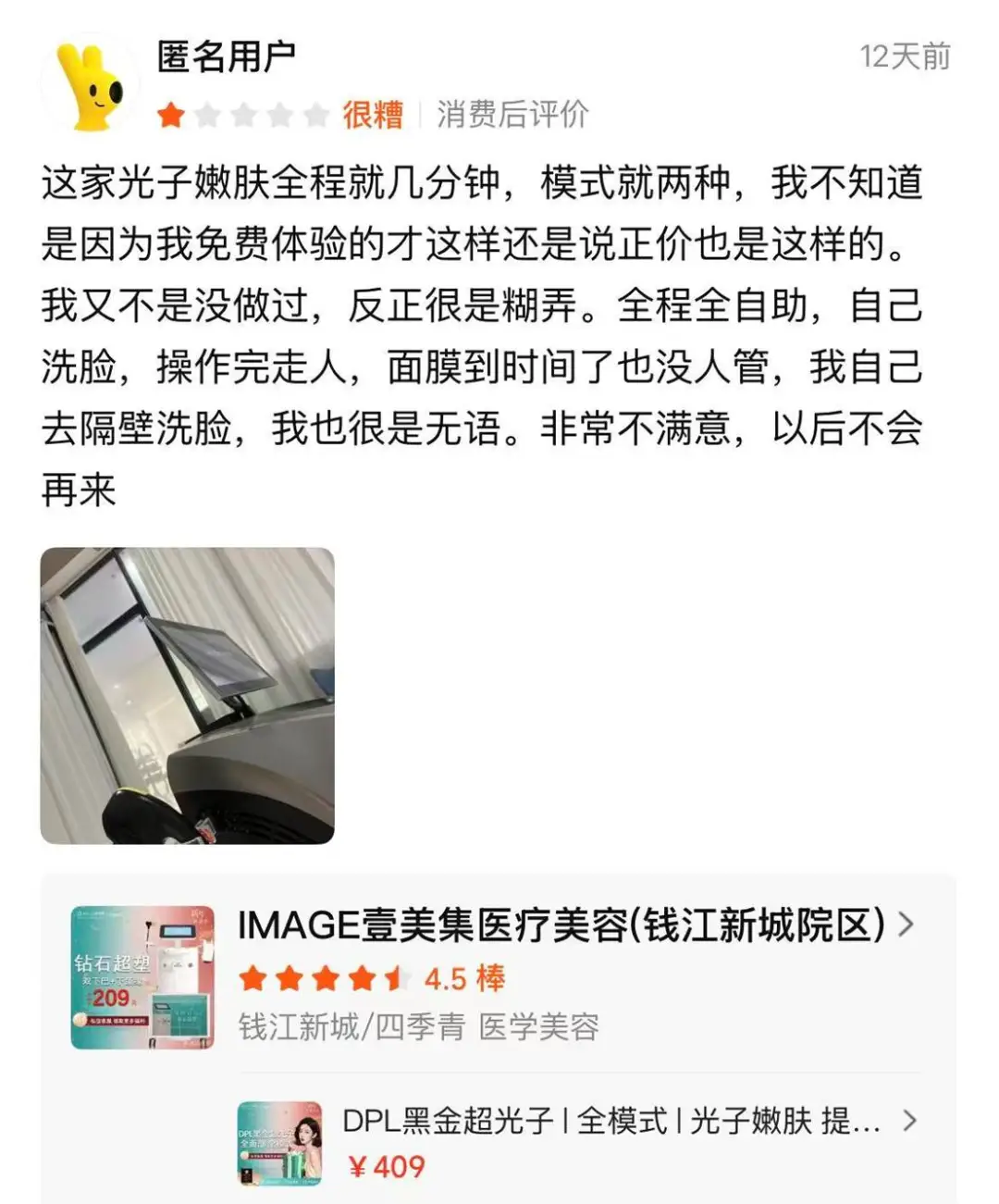 还有消费者在杭州壹美集免费体验了一次光子嫩肤项目,全程仅几分钟、仅两种模式,需自己洗脸、自行揭膜,到点后无人跟进,直言“很是糊弄”。