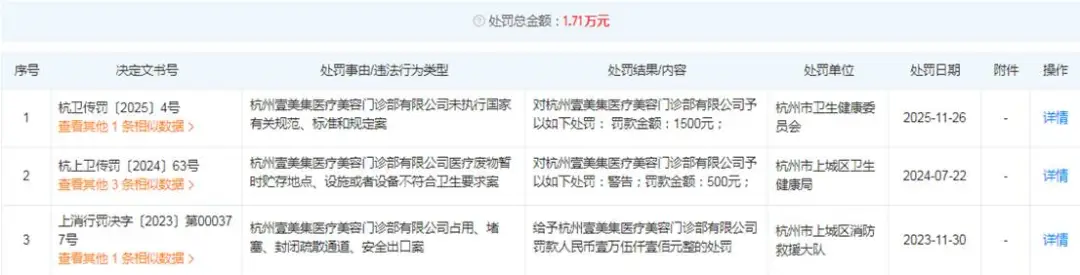 天眼查上的三条行政处罚记录,更是如同一把把利刃,刺向杭州壹美集医美的公信力。