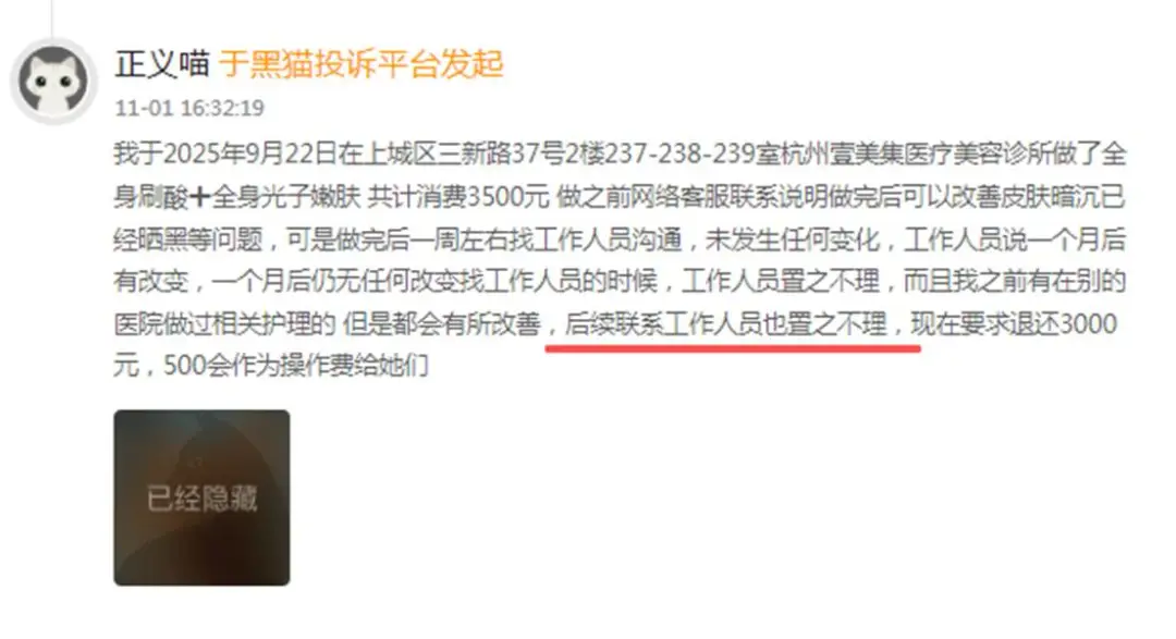 黑猫投诉上,关于杭州壹美集医疗美容的投诉更是五花八门。
