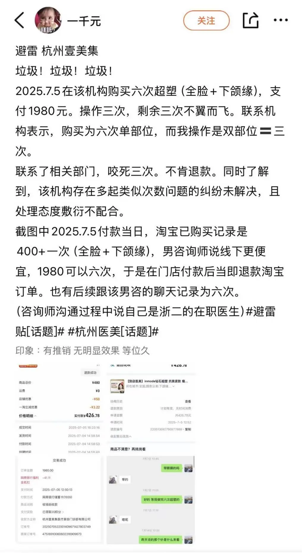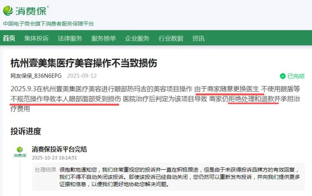 可更让人心寒的是,当消费者找到杭州壹美集医疗美容,希望商家能够承担起应有的责任,处理此次事故、退还项目费用并支付治疗费用时,却遭到了无情的拒绝。商家冷漠的态度、推诿责任的行为,让消费者陷入了孤立无援的境地,只能在漫长的维权道路上艰难前行。