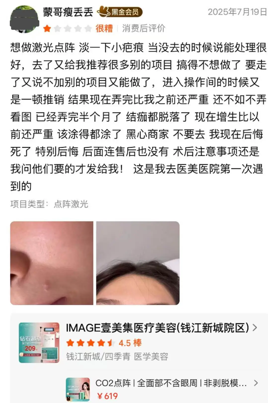 一位消费者本想激光点阵淡疤,被杭州壹美集先承诺“效果很好”,到店后层层加码推销其他项目,拒绝后又说“可以只做原项目”。