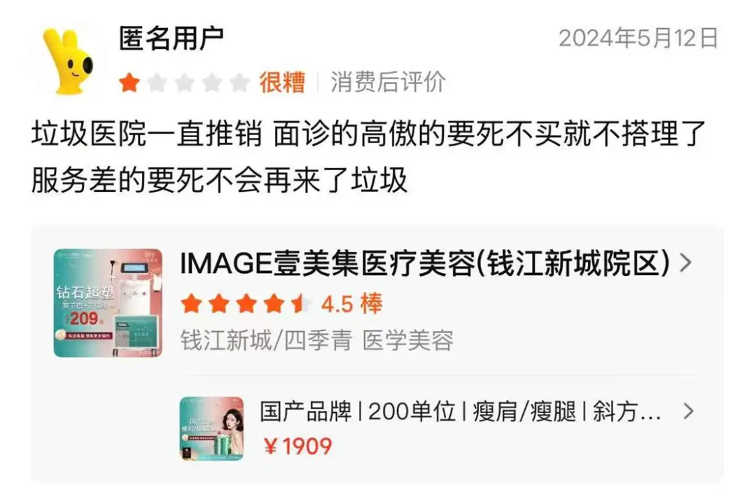 美团平台上也有消费者吐槽:“在杭州壹美集做完项目过后没效果,有点上当受骗的感觉”。医美项目,消费者往往是怀着对美的期待投入时间和金钱,可当最终没有看到任何效果时,这种心理落差是巨大的。消费者会觉得自己的钱打了水漂,被机构欺骗,进而对机构的专业性和诚信产生质疑。
