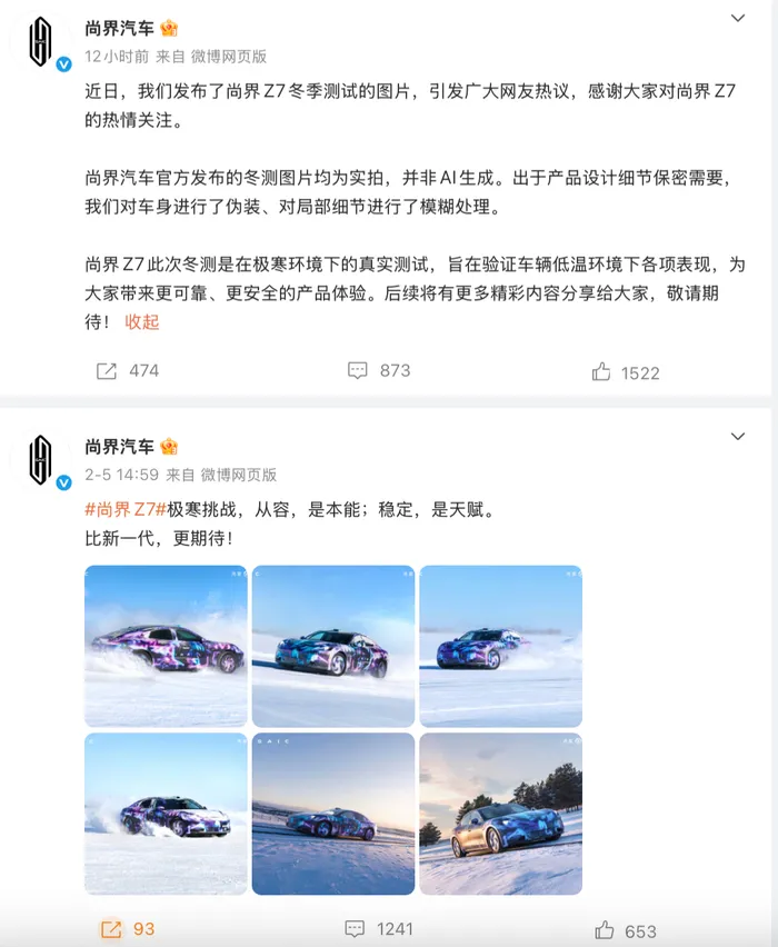 2月9日,尚界汽车就其首款车型Z7冬季测试影像引发的真实性争议作出官方回应。部分测试画面因视觉效果与常规物理成像逻辑存在差异,在社交媒体上受到质疑。作为上汽与华为“鸿蒙智行”合作的新品牌,尚界原计划借此展示Z7性能,但相关影像发布后却意外引发舆论风波。